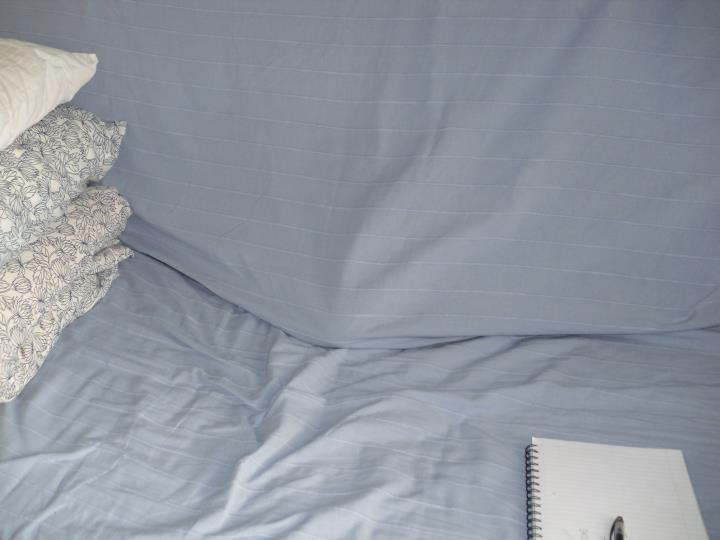 Alyona and Gleb were out. My bed is a fold-away divan. I had converted it into its divan form before going out. It is covered with a loose sheet. I sat down, to type up some of these notes into my laptop, when to my surprise the sheet beside me moved! Moosa (the cat) was underneath the sheet. I was relieved that nothing bad had happened but quite amused. As there was nothing wrong, I went on with what I was doing, and left Moosa beneath the sheet (See the photo).